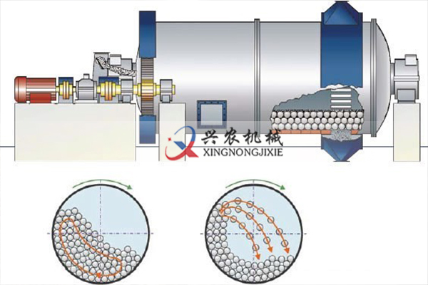 棒磨機(jī)由電機(jī)通過減速機(jī)及周邊大齒輪減速傳動(dòng)或由低速同步電機(jī)直接通過棒磨機(jī)周邊大齒輪減速傳動(dòng),驅(qū)動(dòng)筒體回轉(zhuǎn)。筒體內(nèi)裝有適當(dāng)?shù)哪サV介質(zhì)-鋼棒。磨礦介質(zhì)在離心力和摩擦力的作用下,被提升到一定高度,呈拋落或泄落狀態(tài)落下。 被磨制的物料由給礦口連續(xù)的進(jìn)入筒體內(nèi)部,被運(yùn)動(dòng)的磨礦介質(zhì)所粉碎,并通過溢流和連續(xù)給礦的力量將產(chǎn)品排出機(jī)外,以進(jìn)行下一段工序作業(yè)。